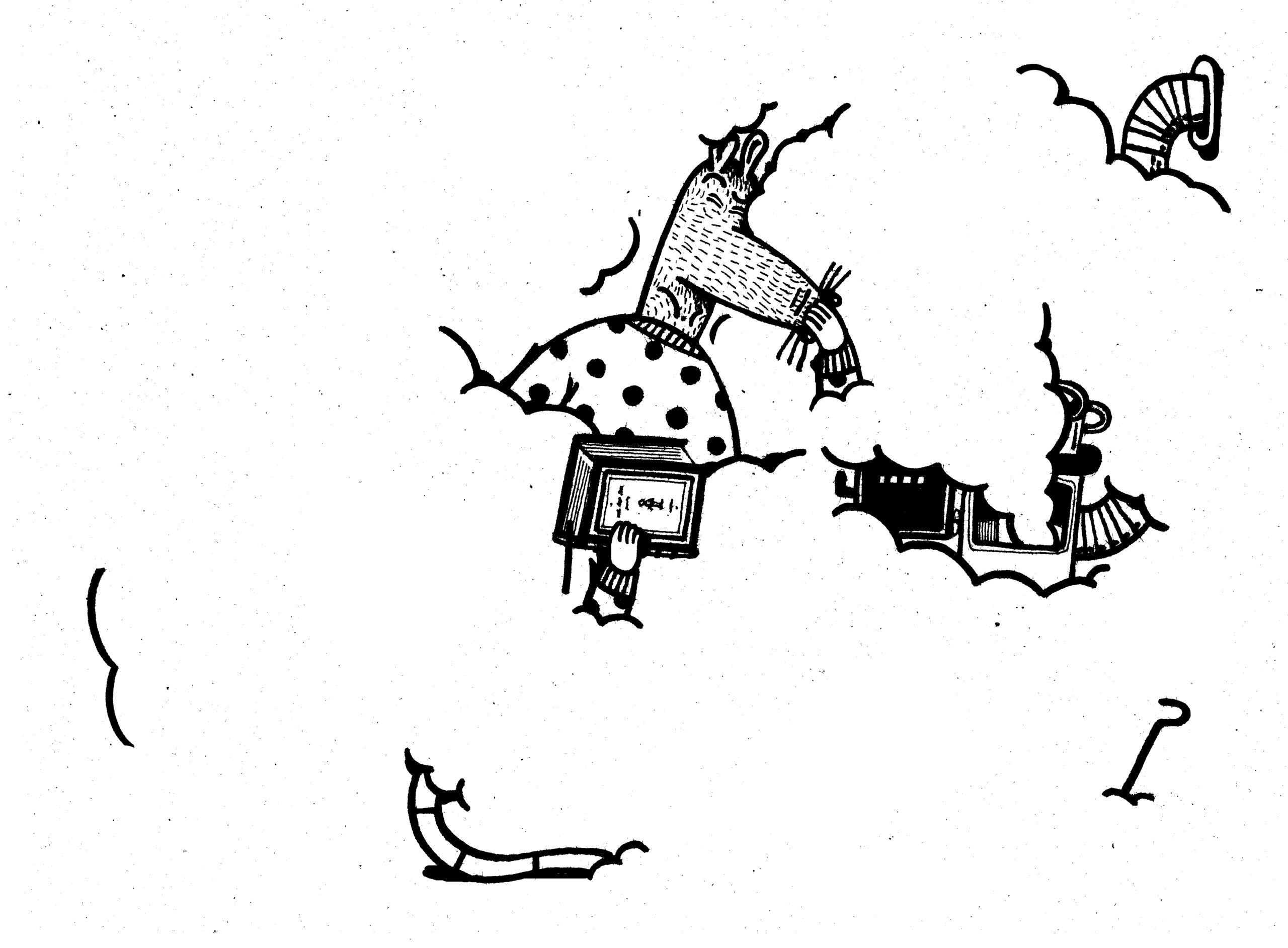 Ten v zimním tichu chodil do knihovny taktéž. Jak jsme ale později zjistili, původně zapůjčené knihy mu nesloužily ke studiu. Začátkem února si přišel pro pět svazků z dějin umění, které mají zvlášť pevné kartonové desky a dokonce se ptal po dalších tlustších knihách. To nám bylo podezřelé. Namátkou jsme se zeptali zdali už má dočtené umění Pravěku. Nejprve si vůbec nemohl vzpomenou a pak z něj vypadlo: „Jo myslíte tu knížku s lesklým papírem? Takové bych si už nikdy nepůjčil, to ne, tolik dyýýmu jsme v noře nikdy neměli … jak z toho vašeho Pravěku,“ chápete to?! Knížky prostě zajišťovaly teplo jeho nory a vůbec mu to nepřišlo divné. Po Stanově zásahu jsou tak škody v knihovně mnohem větší než jsme předpokládali…